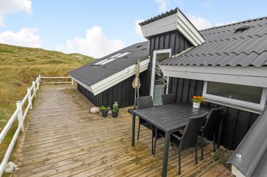 Fra huset er der udgang til en stor terrasse som omgiver det meste af huset, her kan man nyde solen og altid finde et sted med læ. Fra terrassen kan man høre havets brusen. Der er havemøbler, solvogne og grill til rådighed. Fra huset er der blot 20 m til den hvide sandstrand, så fra grunden er der direkte adgang til Vesterhavet. Her kan man gå lange ture og søge efter sten og rav eller ligge sig i en “gryde” og nyde solen og havet. Eller gå op og sætte sig i klitterne og nyde solnedgangen over Vesterhavet. Adgang til Harboøre Centeret.