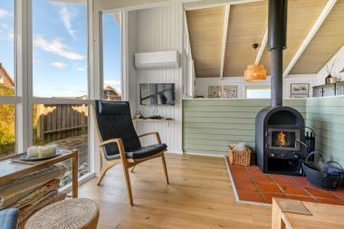 Huset er særdeles velholdt – fremstår lyst og venligt med komfortabelt indrettet stue med forsænket kaminafdeling. Der er gratis trådløst internetadgang i huset. I stuen er der Farve-TV med DVD, DR1 og Apple-TV, så du kan streame egne programmer samt en brændeovn. Virkelig godt indrettet køkken med elkomfur med keramiske kogeplader, køleskab med frostboks, mikroovn og opvaskemaskine. Gulv i stue og køkken er træ. 2 badeværelser. Det ene med Whirlpool og bruseafdeling. Det andet med WC og vaskemaskine. 3 soverum: 1 med dobbeltseng, 1 med køjer og 1 med 3/4 seng. Der er installeret varmepumpe i huset og det betyder at du som gæst kan spare op til 50% på din elvarmeregning – varmepumpen leverer op til 6 gange så meget effekt som den bruger, det betyder at for hver kilowatt-time pumpen bruger yder den varme svarende til ca. 6 kW energien udnyttes dermed langt bedre.