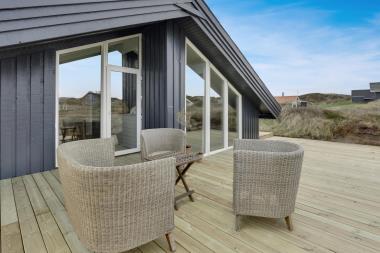 Huset ligger på en ca. 2.600 m2 stor klitgrund. Der er udgang til 3 dejlige terrasser som er forbundet med en dejlig flisebelagt gangsti. Terrassen med udgang fra køkkent er delvis overdækket. Der er havemøbler og solvogne til rådighed. Fra terrasserne kan man høre havets brusen. Nyd en gåtur ved Vesterhavet. Find sten og rav eller sæt jer i klitterne og nyd solnedgangen over havet.
