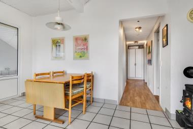 Indendørs mødes I af en lys og imødekommende atmosfære. Opholdsrummet er hyggeligt indrettet med komfortable møbler, brændeovn og underholdning i form af fibernet-tv med danske og tyske kanaler. Køkkenet og spiseområdet ligger i åben forbindelse med stuen og danner et naturligt samlingspunkt for hele familien. Det veludstyrede køkken rummer blandt andet glaskeramisk komfur, køle-/fryseskab, mikroovn og opvaskemaskine.
