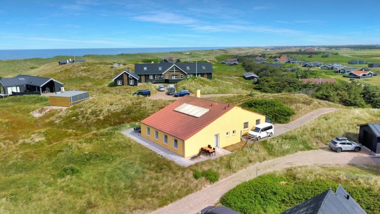 Sommerhus med stor swimmingpool. Huset ligger på en stor og kuperet natur/klitgrund og er en de mest efterspurgte grunde i området; kun 200 m fra Vesterhavet. Der er havudsigt fra grunden. Køkken med opvaskemaskine, microovn. Der er kombineret stue og køkken – i stuen findes brændeovn, farve-tv med DR 1. Parabol (kun tyske programmer) samt radio og bluetooth højtaler, som kan kobles op på en mobil enhed.. Trådløst Internetr. 2 badeværelser med gulvvarme, wc og brus. Poolrummet er indrettet med pool 8 x 4 x 1,45 m, fra poolerummet er direkte adgang til sauna ekstra bruserum i forbindelse med poolafdelingen. 4 soverum: DS + DS + 2ES + 2ES. Barnestol. Vaskemaskine og tørretumbler. Huset har centralvarme og elvarme. Gynger. Åben terrasse med havemøbler. Vand og energiomkostninger sommer ca. kr. 1500 til kr. 2000. Vinter fra kr. 2500 til kr. 3000 afhængig af vejret. 2 Husdyr tilladt.