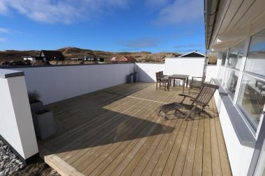 Huset ligger på en ca. 1.295 m2 natur- / klitgrund. Der er to terrasser hvoraf hovedterrasssen er sydvendt, hvor man har udsigt til klitterne og vejen op til stranden. Den anden terrasse ligger på østsiden så her er der ofte læ for vestenvinden. Begge terrasser har læmur som for vinden. Havemøbler, grill og en solvogn. Huset ligger behageligt langt fra vejen, som i forvejen er sparsom trafikeret. Herfra kan man gå direkte over klitten til Vesterhavet. Således er der ikke langt til strandfornøjelser som badning, drageflyvning, lystfiskeri eller vandreture i den friske luft hvor man til tider kan blive blæst helt igennem. Afstand til Ferring Sø er 200 m og Vesterhavets vandkant ligger blot 250 meter fra huset. Herudover ligger huset tæt på en af Vestjylland smukkeste cykel- / vandre ruter der bl.a. byder på mulighed for at se både sø og hav på samme tid samt tæt på indkøb og restaurant. Nærmeste købmand ligger kun 250 meter ved Vejlby Torv som også byder på en cafe. Vi anbefaler også gerne et besøg i havnebyen Thyborøn 15 km nord for sommerhuset eller den gamle købstad Lemvig 13 km mod øst. Dette hus er velegnet til det parret eller den lille familie, der vil bo tæt på havet.