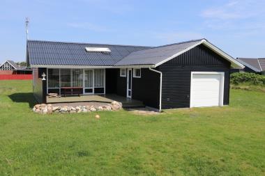 Dette feriehus i træ med overdækket terrasse er beliggende på en naturgrund tæt ved Vesterhavet. Der er garage til bilen. Stue: F-TV med parabolantenne ( dog kun med tyske kanaler) , DVD, stereoanlæg med CD.Gratis internetadgang. Køkken: El-komfur, emhætte, køleskab, fryseskab, mikroovn og opvaskemaskine.. 2 Soverum: (DS) + (2S) . Toilet med WC, håndvask og bruser. Ekstra baderum med indgang fra terrassen med bruser, badekar, sauna. Vaskemaskine og tørretumbler. Åben og overdækket terrasse med havemøbler. El-varme. Bemærk: Der må ikke ryges i huset. Varmepumpe.