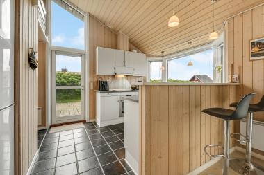 På en 1350 stor naturgrund kun ca. 200 m fra vesterhavet ligger dette pragtfulde træhus. Huset er bygget i 2006 og er smagfuldt og personligt indrettet med trægulve overalt. Lækker køkkenafdeling med microovn, opvaskemaskine og lille fryser. Opholdsstuen er udstyret med brændeovn, dvd, stereoanlæg med cd og farve tv med parabolantenne ( kun tyske kanaler). Gratis internet. 3 dejlige soverum: (DS) + (DS) + (2E) samt en hems med 2 liggemuligheder. Der er opgang i stuen. 2 gulvopvarmede badeværelser -begge med bruser og det ene med spabad og direkte adgang til husets sauna. Til børnene er der gynger, sandkasse, barnestol. Desuden er der vaskemaskine og tørretumbler. Alt i alt et særdeles attraktivt ferietilbud. 1 Husdyr tilladt.
