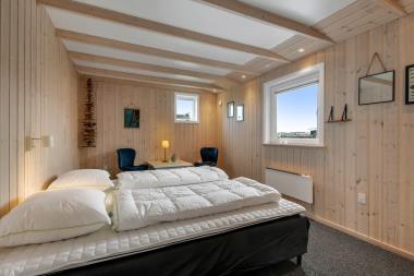 Dette velbeliggende feriehus har 4 soverum (1DS, 1DS, 1DS + 1K). Huset er 120m2 stort og det store lyse opholdsrum er åbent til kip med fantastisk lysindfald fra ovenlysvindue og store vinduespartier, hvorfra der er udsigt til klitterne mod havet. Huset er indrettet med indgang med vaskemaskine, 4 soverum, badeværelse med brus samt åbent og velindrettet køkken i forbindelse med stue. Køkken og stue er et helt fantastisk rum med opgang til stor lys hems. Der er også en hyggelig brændeovn og huset kan desuden opvarmes med varmepumpe og el-radiatorer. Huset er altid rart og varmt uanset vejr og årstid. I det veludstyrede køkken er der kaffemaskine, varmluftsovn, keramiskkogeplade, mikroovn, opvaskemaskine og køleskab med fryser. I stuen er der spisebord, tv-hjørne med sofaarrangement, TV med danske og tyske kanaler samt Chromecast og wi-fi. Max 1 husdyr tilladt.