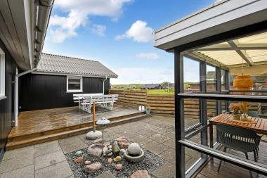 Der er fra stuen og fra entréen udgang til husets indhegnet terrasser mod både syd og vest og mulighed for at nyde solen hele dagen, desuden er der omkring det vestvendte terasseanlæg adgang til ude-bruser med koldt vand, sauna og fantastisk havestue med spiseplads og fantstisk udsigt til de høje klitter ved Vesterhavet. Grill og havemøbler kan rykkes rundt efter behov. Der er mulighed for opladning af el-bil i husets garage. Der er en hundegård.