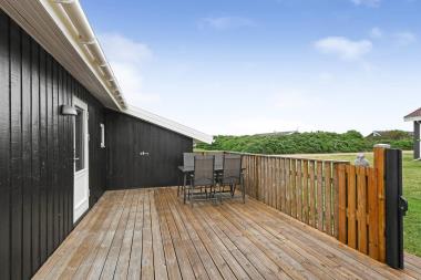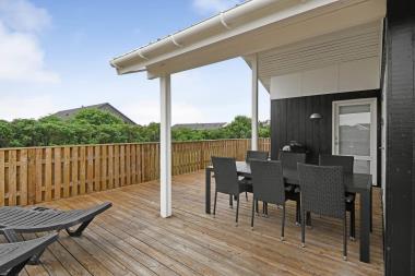 Fra stue og køkkenrummet er der 2 udgange til den store terrasseanlæg som er fortrinsvis syd og østvendt. Dette er meget praktisk, da den dominerende vindretning er vest og dermed har man ofte læ. Terrassen har både havemøbler, grill og 2 solvogne, så her er udstyret i orden til mange hyggelige afslappende timer. Der er kun 300 meter til Vejlby Torv med købmanden og Cafe John Wayne, så dette gør kun ferien endnu mere komfortabel. Vejlby Klit er omgivet af vand på begge sider med Vesterhavet mod vest som altid er et besøg værd. Her kan man bade, lave sandslotte, fiske, flyve med drage eller ganske enkelt blot gå een lang tur og nyde ensomheden eller familiens nærvær. Det samme gælder iøvrigt den tætte beliggenhed til Ferring Sø hvor der går en vandrerute rundt om.