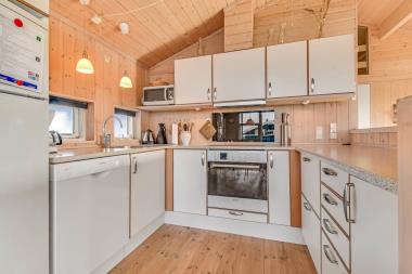 Huset er lækkert og lyst med mange store vinduespartier, så man faktisk kan nyde vejret indenfor uanset vejrliget. Spisebordet er således placeret mod et vestvendt større vindue og herfra kan man virkelig nyde himmelvælvingen. Køkkenet har således også hvad man skal bruge i form af emhætte, glaskeramisk komfur, køleskab, mikrobølgeovn, opvaskemaskine og en separat fryser på 20 liter. Stuen som er kombineret med køkkenet er møbleret med flotte møbler og er udstyret med brændeovn, fladskærm med DR og TV2 samt parabol med tyske kanaler og stereoanlæg med cd. I huset er der ligeledes 3 soveværelser: 2 med dobbeltsenge og en enkelt med 2 enkeltsenge. Herudover er der også en hems med en ekstra soveplads. Man skal dog kravle op af en monteret stige for at komme på hemsen. Badeværelset er stort og rummeligt. Her er gulvvarme, bruser, håndvask, boblebad samt sauna. Der er ligeledes tørretumbler og vaskemaskine huset. Til at opvarme huset er der ligeledes en varmepumpe/aircondition, så man kan holde en konstant temperatur.