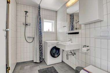 Huset rummer tre gode soveværelser (2 med dobbeltsenge og 1 med køjeseng), et pænt badeværelse med toilet, håndvask, bruser, vaskemaskine og tørretumbler – samt direkte adgang til en skøn sauna. Badeværelset har klinkegulv med gulvvarme, så komforten er i top året rundt.