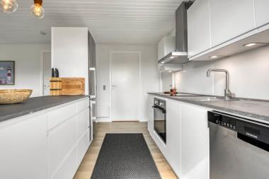 Det veludstyrede køkken har alt, hvad du behøver: glaskeramisk komfur, emhætte, køle-/fryseskab, mikroovn og opvaskemaskine. Spisebordet står i forbindelse med køkkenet, perfekt til hyggelige måltider.