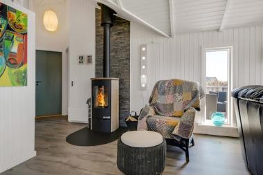 Meget flot, nyrenoveret og velholdt feriehus i træ med kombineret køkken og stue hvor der er åben til kip. Huset er holdt i lyse farver og det store vinduesparti sørger for et godt lysindfald. Stuen er indrettet med gode lædermøbler og spisebord, her er der F-TV med DR-kanaler og tyske kanaler via parabol, radio. Desuden er der en dejlig ny brændeovn og en varmepumpe som begge sørger for en behagelig varme uanset årstid, og er medvirkende til en billigere forbrugsregning. Åbent køkken med elkomfur med keramiske kogeplader, emhætte, køleskab med frostboks, opvaskemaskine. I stue og køkken er der linoleumsgulv. Stort og nyrenoveret badeværelse med toilet, håndvask, bruser og infrarød saunakabine. 3 flotte soverum: 1DS + 1DS + 1DS. Til de mindste gæster er der en barnestol. Der er selvfølgelig også en vaskemaskine og tørretumbler i huset. 2 husdyr er tilladt. Ikke rygerhus.