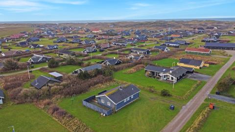 Huset ligger på en 900 m2 naturgrund, med kun 400 m til Vesterhavet. Der er en dejlig terrasse med havemøbler og solvogne som kan stilles efter behov så man altid kan finde et sted i læ eller i solen. Huset er også beliggende tæt på Ferring Sø som har en vandresti omkring hele søen, så man kan nyde naturen omkring hele søen. Stranden ved Vesterhavet ligger i gåafstand fra huset og her indbydes der til forskellige aktiviteter hver dag bl.a. badning, flyve med drager samler sten eller rav eller blot slentre langs vandkanten og nyde havets brusen. Ønsker man lidt mere i ferien kan vi varmt anbefale en tur til fiskerbyen Thyborøn eller den gamle handelsby Lemvig. Begge byer byder på flere gode restauranter og butikker. Alt i alt et særdeles godt tilbud til en eller to familier, der ønsker at tilbringe ferien sammen i rolige omgivelser.