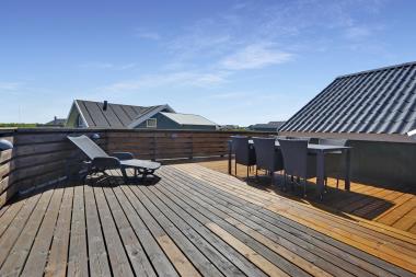 Fra stue er der udgang til et stort og lukket terrasseanlæg. Terrassen er delvis overdækket og omkranset af et stakit så børn og hunde roligt kan færdes på terrassen uden at løbe væk. Flere sæt havemøbler, liggestole og grill. Nyd her både morgen- og aftensolen i havemøblerne eller på en af de 2 solvogne. Grill er naturligvis også standard og børnene kan underholde sig med sandkassen på grunden umiddelbart lige uden for terrassen, der er desuden også et bål sted hvor man kan sidde og nyde de dejlige aftener. Huset ligger godt i forhold til vandreture hvor der hverken er langt til Ferring Sø eller Vesterhavet. I sommerhalvåret fra påske til efterårsferie er der kun cirka 600 meter til nærmeste købmand ved Vejlby Torv hvor der også er en Cafe som har åbent i sæsonen. I vinterhalvåret må man tage de 6 km til Harboøre hvor der både er en Rema1000 og en Brugs.