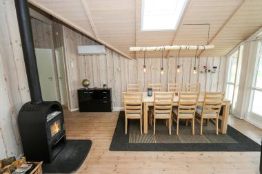 Køkkenet fremtræder lyst og venligt med store vinduer. Her er mikroovn, opvaskemaskine, køle-/fryseskab og glaskeramisk komfur. Fra køkkenet kommer man ind i stuen, og her er der spisebord samt flotte møbler. Stuen er udstyret med brændeovn, TV samt parabol med tyske kanaler og Chromecast. Hertil kommer DVD og stereoanlæg. Gratis internetadgang er også muligt. Der er installeret varmepumpe i huset og det betyder, at du som gæst kan spare en del på din elvarmeregning – varmepumpen leverer op til 4 gange så meget effekt som den bruger, det betyder at for hver kilowatt-time pumpen bruger yder den varme svarende til ca. 4 kW og energien udnyttes dermed langt bedre. Her er 3 gode soveværelser, hvoraf 2 har dobbeltsenge og 1 med 2 enkeltsenge. Der er 2 badeværelser: Det ene med spa, bruser og sauna samt gulvvarme og det andet blot med toilet og håndvask. I bryggerset forefindes vaskemaskine og tørretumbler, som er lækkert og nemt at benytte i sin ferie.