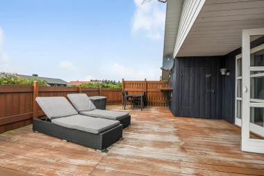 Fra stue er der udgang til et stort, delvis overdækket og indhegnet terrasseanlæg (ca. 80 m2 heraf er ca. 10m2 delvis overdækket) . Terrassen er omkranset af et stakit. Flere sæt havemøbler, liggestole og gasgrill. Området omkring Vejlby og Ferring sø ligger ikke langt fra det brusende Vesterhav (550 m) og stranden. Naturen indbyder meget til udendørsaktiviteter året rundt – uanset om det er gåture i landskabet omkring søen eller en strandtur. Områdets købmand ligger tæt på huset. I højsæsonen byder han på frisk morgenbrød, og her kan daglige indkøb også klares. Der er heller ikke langt til dagligvarebutikker i både Vejlby og Harboøre – Og er du i bil kan du køre til Lemvig – ‘Smilets by’ eller den meget populære turistby Thyborøn, hvor du begge steder finder flere dagligvarebutikker, spisesteder samt velfungerende detailhandel. Det ideelle huse for den 2 personer eller den lille familie som ønsker en beliggenhed tæt på sø, hav og strand