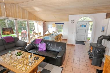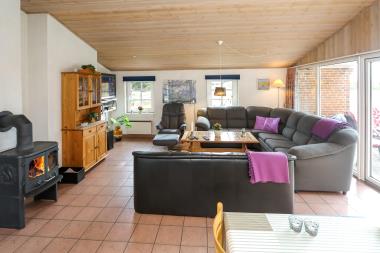 Når I træder ind i huset, mødes I af en rummelig og praktisk entre med god plads til overtøj og sko. Herfra går turen videre ind i det indbydende opholdsrum, hvor det veludstyrede køkken ligger i åben forbindelse med stuen. Køkkenet rummer alt, hvad I behøver til feriens madlavning, blandt andet opvaskemaskine, varmluftovn, mikrobølgeovn og fryser. Den lyse og rummelige stue med brændeovn, surroundanlæg, 55″ TV med digital parabol og soundbar skaber en varm og hyggelig atmosfære, som indbyder til afslapning efter en dag ved havet. Husets indvendige stil er præget af vandskurede vægge, trælofter med synlige bjælker og dejlige opvarmede klinkegulve.