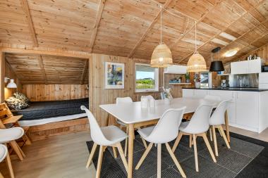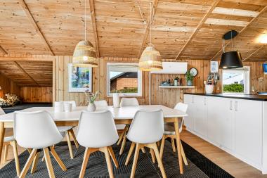 Køkken og stue er i samme rum og væggene i huset er træbeklædte, så man får fornemmelsen af naturen helt med ind i huset. Køkkenet har emhættte, glaskeramisk komfur, indbygningsovn, køle-fryseskab, mikrobølgeovn og opvaskemaskine. I stuen findes sofagruppe med stuebord, spisebord samt brændeovn og varmepumpe hjælper med at reducere udgiften til varmeregningen. Underholdningen er også på plads i form af DVD-afspiller, stereoanlæg med CD og fjernsyn med DR1 og TV2 samt tyske kanaler. I enden af stuen er der større vinduespartier som sikrer udsigten til området. Der er også en stueudgang mod syd som fører ud til den store sydvendte terrasse.