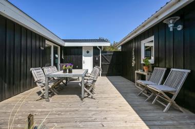 Huset ligger på en stor, dejlig naturgrund. Fra fordelergangen er der udgang til et helt fantastisk, lukket overdækket terrasseanlæg (60 m2)  med  havemøbler, liggestole, hynder, parasol og grill. Et terrasseanlæg hvor der altid er læ, selv på blæsende dage. Nyd en grillaften i al slags vejr eller nyd solen og beliggenheden på en dejlig naturgrund, som bekræfter de mange muligheder. I Vejlby Klit og omegn er der rigtig gode muligheder for at cykle, vandre eller løbe en tur og kun ca. 200m fra huset ligger det brusende Vesterhav som hver dag byder på nye maleriske oplevelse. Ca  400 m fra huset ligger Ferring Sø hvor man kan Kite surfe. I sæsonen kan du hente morgenbrød, købmandsvarer eller måske invitere familien ud at spise, kun ca. 10 min fra huset. Dette helt specielle og meget charmerende feriehus byder på en ferieoplevelse i særklasse uanset årstid.