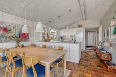 Allerede når bilen rammer grusvejen, med få meter til huset, bliver det klart at beliggenhed og hus er noget ganske særligt. Når man drejer ind på grunden og parkerer bilen ved huset begynder ferien. Huset er 92 m2. En dejlig entre med afhængeplads byder jer velkommen og fører jer direkte ind i et flot, moderne samtalekøkken. Fra både køkken og opholdsstue er er fantastisk udsigt til klitterne. Samtalekøkkenet har alt i service og køkkengrej og er også udstyret med komfur med glaskeramiske kogeplade, emhætte, mikroovn, køleskab med fryseboks og opvaskemaskine. Tæt ved køkkenet står spisebordet som hele familien kan samles ved. Opholdsstuen har dejlige polstermøbler, hvorfra såvel danske som tyske kanaler samt streamingtjenester via Chromecast / Google TV kan ses på fladskærmen som er opsat på væggen. Et yderst energivenligt hus med en strømbesparende varmepumpe som sørger for at huset nemt og billigt kan opvarmes, så man kan holde varmen også på kolde efterårsdage. 3 dejlige soveværelser (1DS, 2ES, 1ES) alle med trægulve. Husets badeværelse har bruser, toilet, håndvask og klinkegulv med gulvvarme. Ekstra toilet med håndvask, vaskemaskine og gulvvarme. Barnestol forefindes. Alle opholdsrum har trægulve med gulvvarme som er meget rengøringsvenligt. Dejligt aflåseligt skur til opbevaring af cykler eller lignende. Her er der også  installeret 3-faset 220 volt cee(blå) samt 380 volt cee (rød) 16amp stik, der kan lade op til 11 kWh. Så har man el-cykel, el-bil eller en Plug-In hybrid, så er der mulighed for opladning ved huset. Ikke ryger hus. Husdyr er ikke tilladt.