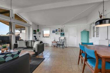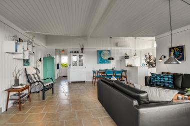 Huset er meget velholdt og dejligt indrettet og indeholder en stue som er kombineret med køkkenet. Køkkenet er godt udstyret og indeholder glaskeramisk komfur, køle-/fryseskab, opvaskemaskine og mikroovn, der er klinkegulv i køkkenet. Stor åben stue med stort vinduesparti som sørger for et godt lysindfald i hele rummet. Stuen er indrettet med lædermøbler, spisebord med stole og TV med danske og tyske programmer, CD-afspiller, gulv i stuen er klinker. Desuden er der en dejlig brændeovn og en varmepumpe som giver en behagelig og hyggelig varme, og er medvirkende til en billiger forbrugsregning. Der er 3 gode soverum i huset: 1DS + 1DS + 2S, der er gulvtæppe i soverummene. Badeværelse med toilet, håndvask og bruserbabybadekar og puslebord. Der er 1 barnestol til de mindste gæster. 1 husdyr er tilladt. Ikkeryger hus.