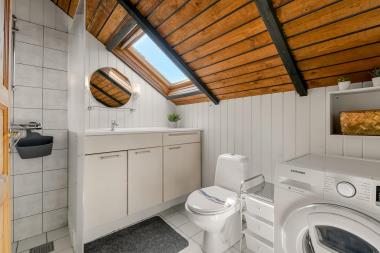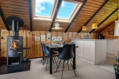 Fra opholdsstuen er der udgang til et stort terrasseanlæg med stakit. På den store, delvis overdækket, lukket træterrasse er der havemøbler, grill og liggestole. Sid ugeneret på terrassen og nyd udsigten når solen går ned bag de høje klitter mens lyden af Vesterhavets bølger nydes. Fra Stuen ses de høje klitter ved Vesterhavet som ligger kun ca. 300 fra huset. Det giver lyst og inspiration til en gåtur ved vandet uanset vejr og vind og byder hver dag på en ny fortælling. I sæsonen kan du hente morgenbrød, købmandsvarer eller måske invitere familien ud at spise kun ca. 5 min på gåben fra huset. Perfekt til en familie som ønsker central beliggenhed i dejlige rammer hele året rundt.
