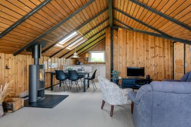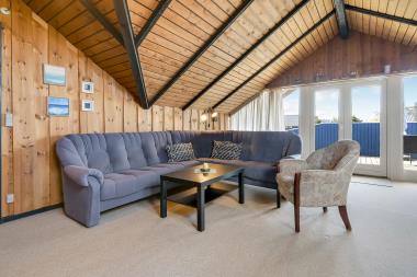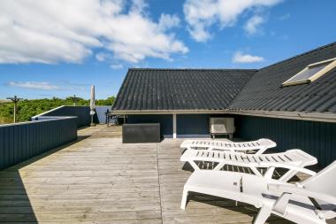 Fra opholdsstuen er der udgang til et stort terrasseanlæg med stakit. På den store, delvis overdækket, lukket træterrasse er der havemøbler, grill og liggestole. Sid ugeneret på terrassen og nyd udsigten når solen går ned bag de høje klitter mens lyden af Vesterhavets bølger nydes. Fra Stuen ses de høje klitter ved Vesterhavet som ligger kun ca. 300 fra huset. Det giver lyst og inspiration til en gåtur ved vandet uanset vejr og vind og byder hver dag på en ny fortælling. I sæsonen kan du hente morgenbrød, købmandsvarer eller måske invitere familien ud at spise kun ca. 5 min på gåben fra huset. Perfekt til en familie som ønsker central beliggenhed i dejlige rammer hele året rundt.