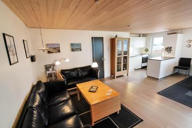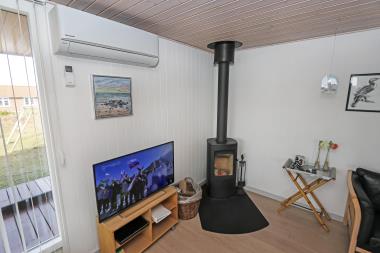 Stue og køkken er hyggeligt samlet i et stort rum. I stuen er der brændeovn, sofagruppe, stuebord, fladskærm med DR, TV2 og tyske kanaler, CD- og DVD-afspiller og radio. Hertil kommer et spisebord ved siden af køkkenet, som er udstyret med glaskeramisk komfur, mikrobølgeovn, opvaskemaskine og køleskab m. lille frostboks. Sovemulighederne udgøres af 3 soveværelser, hvoraf de 2 soveværelser har en dobbeltseng hver og den sidste har 1 køjeseng. Badeværelset byder på noget, for et sommerhus, så sjældent som er gammeldags badekar med bruser samt naturligvis håndvask og toilet. Herudover er der en vaskemaskine i huset, som er praktisk at have. Ikke rygerhus