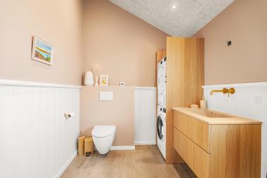 Der er udgang til det store og unikke terrasse anlæg, hvor der også er en udendørs spa og 2 udendørs brusere med koldt og varmt vand. 2 badeværelser begge med toilet, håndvask og bruser samt klinkegulv med gulvvarme, det ene er vaskemaskine og tørretumbler. Fra det ene badeværelse er der desuden udgang til terrassen og en af bruserne, så man kan gå i bruser, hvis man har været en tur i Vesterhavet og derefter gå ind i huset gennem badeværelset. Huset lejes ikke ud til ungdomsgrupper. Har man el-bil eller en Plug-in hybrid, så er der opsat lade boks. Ikke ryger hus. Husdyr ikke tilladt.