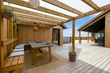 Der er udgang til det store og unikke terrasse anlæg, hvor der også er en udendørs spa og 2 udendørs brusere med koldt og varmt vand. 2 badeværelser begge med toilet, håndvask og bruser samt klinkegulv med gulvvarme, det ene er vaskemaskine og tørretumbler. Fra det ene badeværelse er der desuden udgang til terrassen og en af bruserne, så man kan gå i bruser, hvis man har været en tur i Vesterhavet og derefter gå ind i huset gennem badeværelset. Huset lejes ikke ud til ungdomsgrupper. Har man el-bil eller en Plug-in hybrid, så er der opsat lade boks. Ikke ryger hus. Husdyr ikke tilladt.
