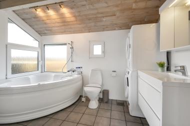 Komfortabelt indrettet feriehus i træ, stuen er åben til kip og med store vinduespartier, som giver et rigtig godt lys inde i huset. Stuen er opdelt i spisestue, som er kombineret med det åbne køkken, og opholdsstuen som er indrettet med gode møbler, hvor man kan sidde og nyde udsigten over klitområdet og slappe af foran den knitrende brændeovn Eller du kan se et af dine yndlingsprogrammer på Smart-TV med danske og tyske programmer samt mulighed for streaming af TV / radio / Apps, der er desuden DVD afspiller samt CD. I både køkken og stue er der klinkegulve med gulvvarme 5 gode soverum som er med 1DS + 1DS + 1DS + 2S + 2S. Der er ligeledes 2 hemse. Til de små gæster er der barneseng og barnestol til rådighed. Nyt køkken med alle tænkelige hjælpemidler bl.a. opvaskemaskine og mikroovn samt køle-fryseskab. Huset råder over 2 badeværelser begge med gulvvarme, toilet, håndvask og bruser, det ene er med spabad og direkte adgang til saunaen. Der er installeret en varmepumpe i huset som er energibesparende. 1 husdyr er tilladt.