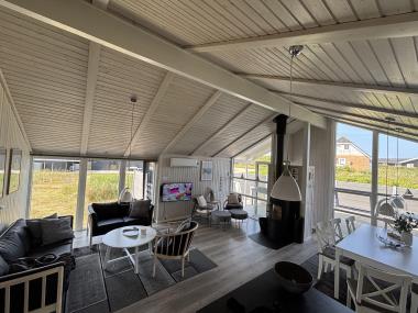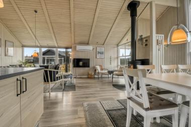 96 m2 stort, Rummeligt og komfortabelt indrettet feriehus i træ. Opholdsstuen er åben til kip og store vinduespartier, giver et rigtig godt lys inde i huset. Opholdsstuen er opdelt i spisestue, som er kombineret med det åbne nye køkkenhjørne. Opholdsstuen med, lædermøbler, spisebord, bluetoohthøjtaler, Smart-TV med danske og tyske programmer samt mulighed for streaming af TV/radio/apps. Nyd udsigten over området og slap af foran den knitrende, nye brændeovn som sammen med varmepumpen hjælper med at reducere udgiften til varmeregningen. Flot, nyt og praktisk hårdt gulv i opholdsrum og køkkenhjørne. 4 gode soverum (2ES, 1DS, 1DS, 1KS) samt en hems med 2 ekstra sovepladser) I hvert soveværelse med dobbeltseng er der et Smart-TV med mulighed for streaming af egne programmer. Til de små gæster er der puslepude og babybadekar til rådighed. Nyt køkkenhjørne med alt i service / køkkengrej samt komfur med glaskeramiske kogeplader, emhætte, opvaskemaskine, køleskab med fryseboks og mikroovn. Huset råder over 2 badeværelser begge med klinkegulv med gulvvarme, toilet, håndvask og bruser. Det ene badeværelse er med helt nyt spabad og direkte adgang til saunaen samt ny vaskemaskine. Ikke ryger hus. 1 husdyr er tilladt.