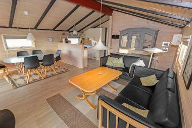 Allerede når bilen når grusvejen op til huset, kan man se den unikke beliggenhed huset har. Dette velholdte træferiehus er indrettet med ludbehandlede vægge og lofter samt vinduer, der giver et godt lysindfald i rummene. Huset er renoveret i 2019 med blandt andet nyt køkken og stue med TV-satellit (tyske kanaler) og danske kanaler DR, stereoanlæg med CD og DVD-afspiller. Stuen er indrettet med gode lædermøbler og en dejlig brændeovn, som sammen med varmepumpen sørger for en behagelig varme uanset årstid. Køkkenet, som er kombineret med stuen, er udstyret med glaskeramisk komfur, opvaskemaskine, emhætte, køle-/fryseskab, mikroovn og alt hvad man har brug for af service og kogegrej. Spisebordet er placeret tæt på køkkenet. Der er gratis internetadgang. Huset har 2 soveværelser: (DS) + (2K). Der er også en alkove med 2 sovemuligheder og et anneks med DS. Til de mindste gæster er der barneseng og højstol. Fra alle vinduer i opholdsrummene har man en fantastisk udsigt til de høje klitter ved Vesterhavet. Husdyr er ikke tilladt. Det er et røgfrit hus.