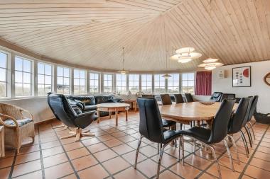 Stråtækt feriehus med pool, spa pragtfuld beliggende i klitterne kun 150 m fra vesterhavet på en 3000 m2 stor kuperet natur-klitgrund med kig til havet fra grunden. Huset er bygget i 1993. Til huset hører åben og overdækket terrasse med havemøbler.Gulvene i huset er belagt med klinker, dog er der tæpper i soverummene.I den store poolafdeling er husets store swimmingpool ( 8,0 x 4,0 x 1,45 m ), 3 pers spa og badeværelse med gulvvarme og bruser. Herfra er der adgang til husets sauna. Køkken med keramisk komfur, opvaskemaskine, mikroovn og 50 l fryser. Det store opholdsrum som er i forbindelse med køkkenet er udstyret med brændeovn, dvd, stereoanlæg med cd og farve tv med med DR 1. Parabolantenne (dog kun med tyske kanaler). Der er trådløst internet i huset. Fra køkken og stue har man man en flot udsigt ud over poolrummet. Huset indeholder endvidere to separate soveafdelinger med tilhørende badeværelser. I badeværelserne er der bruser. Obligatorisk slutrengøring. Huset har 5 soverum : (DB) + (DB) + (DB) + (2E) + (2K) Huset bliver opvarmet med olie. Separat rum med vaskemaskine og tørretumbler. Desuden er der barnestol. Bemærk : højest et husdyr er tilladt. Et dejligt feriehus som på alle årstider vil kunne danne rammen om en vellykket ferie.