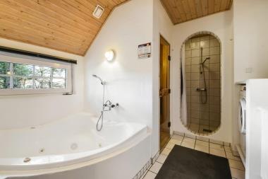 Virkelig flot og hyggeligt indrettet feriehus til 8 personer i sten med stråtag. Huset er beliggende i en lille skov i gåafstand til havet. Indgangen er også en fordeler gang til soveværelser og badeværelser. Fra gangen kommer man ind i det åbne køkken som er kombineret med stuen. Køkkenet er godt udstyret og indeholder elkomfur med glaskeramiske plader, køleskab med frostboks, mikroovn, airfryer og opvaskemaskine. Fra køkkenet er der udgang til terrasse. Stuen er er godt møbleret med lækker hjørnesofa, spisebord og TV med danske og tyske programmer, der er ligeledes fra stuen udgang til terrassen, der er desuden CD og Radio. Dejlig brændeovn som giver en behagelig varme også i de kolde perioder. Huset råder over 3 soverum: 1DS + 1DS + 2S. Desuden er der i gangen en stejl trappe op til hemsen hvor der er 2 sove muligheder. 2 Badeværelser som begge er med gulvvarme. Det ene er med toilet og håndvask og det store badeværelse er med bruser, spa og adgang til sauna, her er desuden også en vaskemaskine.  Der er trægulve i alle opholdsrum og klinker på badeværelserne. 2 husdyr er tilladt. Rygning er ikke tilladt.