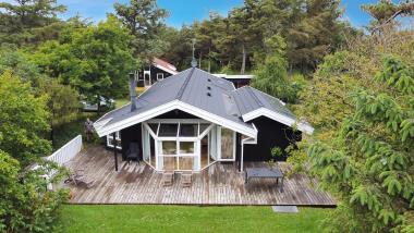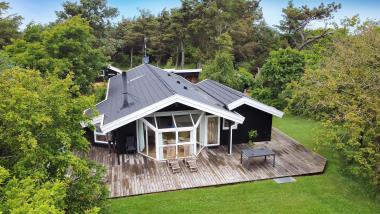 Dette flotte feriehus, som ligger på et af de bedste grunde i området kun små 200 M. fra Vesterhavet og ved lille skov, er alt hvad en god ferie behøver. Grunden på 2500 qm ligger fredelig og direkte op til store åbne friarealer. Huset har store vinduespartier og er derved særdeles lyst og venligt. I huset er der 3 dejlige værelser og en hems med 2 madrasser. I de 3 værelser er der hhv. 2 dobbeltsenge, 2 enkeltsenge. Parabol dog kun med tyske kanaler. Der er 2 gulvopvarmede badeværelser – det ene med spabad og med direkte adgang til sauna. Man kan altid finde læ og nyde solen på terrassen på 86 kvm, som omgiver huset. Havemøbler, liggestole, gynge og sandkasse. – Husdyr ikke tilladt –