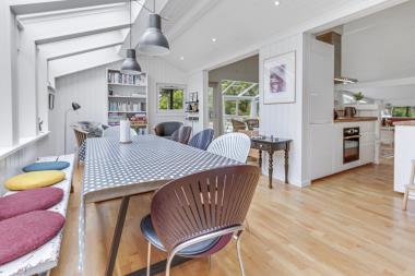 Køkkenet er fuldt udstyret med alt, hvad I behøver for at lave lækre måltider: opvaskemaskine, el-keramisk kogeplade, indbygningsovn, køleskab og meget mere. Spisepladsen ligger i forlængelse af køkkenet, så I kan nyde maden sammen i hyggelige omgivelser.