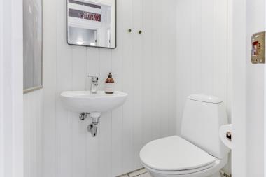 Huset har to moderne badeværelser, det store badeværelse er med toilet, håndvask, bruser og gulvvarme. Gæstetoilet med håndvask, toilet og gulvvarme. Overalt i huset er der rengøringsvenlige gulve.