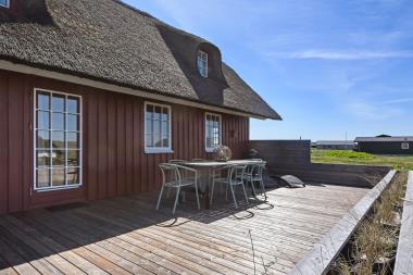 Udenfor har huset en dejlig, nyanlagt sydvendt træterrasse med indhegning mod vest og syd. Her kan man benytte husets solvogne og havemøbler samt grill. Huset byder endda også på en østvendt terrasse hvor man kan sidde og nyde morgensolen. Ellers ligger havet jo kun en kort tur væk og det er altid en fornøjelse at komme op at se hvordan havet nu “har det”. Om sommeren er der fine bademuligheder og børnene kan få timevis til at gå med at lave sandborge eller små dæmninger i sandet, mens de voksne kan ligge og slappe af. Her er nemlig altid masser af plads, så man føler man får stranden for sig selv. Der er 1,5 km til nærmeste indkøbsmulighed i Vrist, som dog kun har åbent i fra påske til november. Aldi og Brugsen i Harboøre er der 2 km til hvis man går og kører man i bil er der 3,5 km.