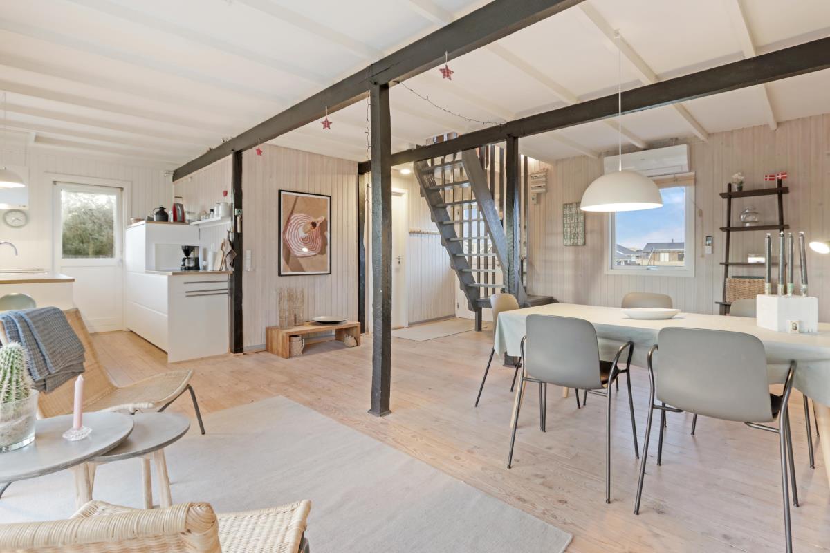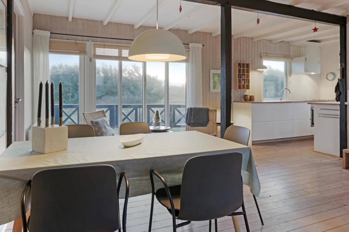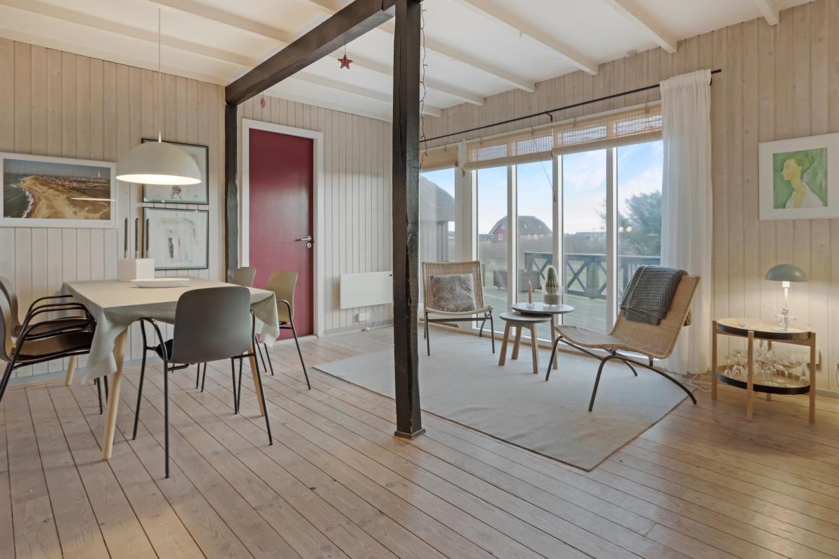 Feriehuset er beliggende på en 2.616 m2 stor klitgrund kun 100 meter fra Vesterhavet. Dejligt, romantisk terrasseanlæg med havemøbler, solvogne og grill. Nyd den helt unikke mulighed det er at sidde på terrassen samtidig med, at man kan høre Vesterhavet lige på den anden side af klitterne, Der er også rig mulighed for at nyde solen, hinanden eller en god grillaften. Gå en tur med hunden i det rolige feriehusområde, henover de høje klitter og straks derefter åbenbarer Vesterhavet sig. Hver dag byder Vesterhavet på nye maleriske oplevelse, der invitere til en frisk gå- eller løbetur. Eller hvad med en lille tur på ca. 10 – 15 min op til områdets lille købmand, som i sæsonen har åbent og byder på frisk morgenbrød og hvor de daglige indkøb også kan klares. Så hvad enten du er til aktiv ferie eller total afslapning danner dette flotte feriehus den perfekte ramme både hvad angår hus, beliggenhed og omgivelser. Indenfor kort køreafstand nås både den aktive handelsby i Lemvig med flere specialbutikker eller den unikke fiskerby Thyborøn, som udover den aktive fiskerihavn også byder på badestrand og op til flere aktivitetstilbud, som alle er et besøg værd.