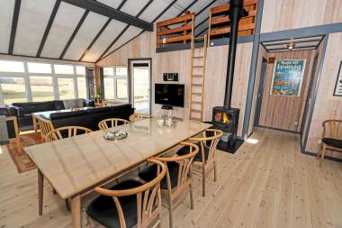 Godt feriehus på ca. 110 m2 fra år 2000 med udsigt til de høje klitter ved Vesterhavet. Huset har 3 værelser (1DS, 1DS, 1DS). 2 hyggelige hemse, hvor der er mulighed for at sende beskeder fra den ene hems til den anden via smart snoretræk. Huset er praktisk indrettet i lyse og venlige farver og med pæne møbler. En dejlig entré med vaskemaskine og tørretumbler byder jer velkommen. Funktionelt og veludstyret køkkenhjørne med bl.a. opvaskemaskine, køleskab med fryseboks, mikroovn, emhætte, nedsænket keramiske kogeplader og separat indbygningsovn. Opholdsstuen har fladskærms-TV med Fibernet-TV kanaler -tyske og danske, DVD / CD-afspiller, radio, spiseplads samt en hyggelig brændeovn, der sammen med den opsatte varmepumpe sørger for at alle kan holde varmen selv på de kolde, charmerende efterårsdage. Stort, moderne badeværelset med bl.a. spa, direkte adgang til saunaen, bruseniche, toilet, håndvask og klinkegulv med gulvvarme. Barnestol og barneseng er i huset. Ikke ryger hus. Max. 2 husdyr tilladt.