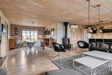 Flot bjælkehus med gratis Internet. Beliggende på en stor naturgrund. Godt udnyttet feriehus med plads til 8 personer – men også ideelt til den mindre familie eller parret som søger et dejligt hus til en ferie på alle årstider.