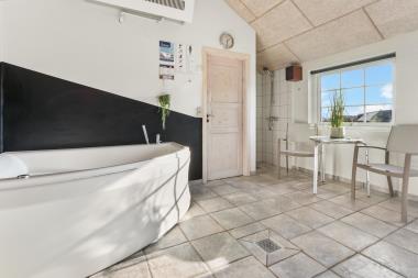 I fantastiske omgivelser på en 1670 m2 naturgrund kun ca. 50 m fra vesterhavet ligger dette velholdte og flotte stråtækteferiehus( bygget i 2005) med pool, spa og sauna Køkkenet er veludstyret med bla. opvaskemaskine, microovn og 50 l fryser. Opholdsstue med brændeovn, dvd, stereoanlæg med cd og farve tv med parabolantenne( dog kun med tyske kanaler.) Gratis internetadgang. Svimmingpool : 3×6 m und 1,50 m dyb med undervandsbelysning. Spa Huset har 2 badeværelser begge med gulvvarme og bruser, 1 i poolafdelingen og 1 i forbindelse med soverummene. Huset fremstår overalt som lyst og venligt og der er 4 dejlige værelser. De 4 soveværelser: (DS) + (DS) + (2 ES) + (2 ES). Der er gulvvarme i helehuset. Af andet udstyr kan nævnes vaskemaskine, tørretumbler, barnestol, gynger og sandkasse Terrasse med havemøbler og liggestole. Et særdeles velegnet feriehus til en eller to familier – uanset årstiden. Huset er energivenligt da al opvarmning af vand til bad, pool og spa er olieopvarmet. 2 husdyr tilladt Vand og energiomkostninger sommer ca kr. 800 til kr. 1500. Vinter ca. kr. 1200 til kr. 2200 afhængig af vejret.