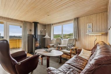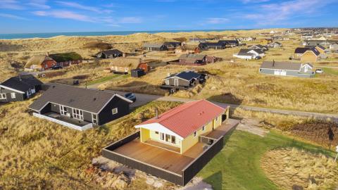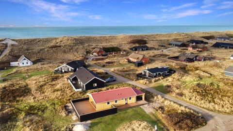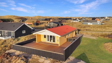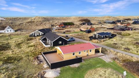 Huset har udgang til en dejlig, delvis overdækker, indhegnet terrasse med udsigt til de høje klitter. Der er havemøbler og liggestole. Parker bil i carporten og flyt ind i dette velbeliggende, charmerende sommerhus tæt ved Vesterhavet. Tænd grillen og nyd aftensmaden med dine kære til en fortryllende solnedgang og lyden af bølger der som skyller i land lige på den anden side af de betagende klitter som ligger ca. 100 m fra huset.