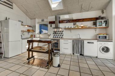 Køkkenet er fuldt udstyret med glaskeramisk komfur, emhætte, køle-/fryseskab, opvaskemaskine og mikroovn, så madlavning bliver en fornøjelse. Til opvarmning er der både varmepumpe og brændeovn, som giver behagelig og energibesparende varme året rundt.