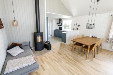 Indbydende og velindrettet feriehus på 116 m2. Huset byder på entré med plads til overtøj. Køkkenhjørne og stue glider let og naturligt sammen, og derfor kan familien hygge sig sammen, når der skal laves noget i køkkenet. Køkkenhjørnet er veludstyret med bla. keramiske kogeplader, indbygningsovn, mikroovn, emhætte, opvaskemaskine, køleskab med fryseboks og alt i service og køkkengrej. Mod opholdsstuen afgrænses køkkenhjørnet at en lille halvvæg. På vej ind i stuen går man forbi et dejligt spisebord, som er praktisk placeret lige ved køkkenhjørnet. Opholdsstuen er indrettet med pæne nye lædermøbler, Smart-TV med danske og tyske programmer samt mulighed for streaming af TV / radio / Apps, så har du en mobiltelefon eller et andet device med kan du streame hvad du nu har abonnement. DVD/CD/Radio. En dejlig brændeovn og varmepume sørger for ekstra hygge samt varme til de rå dage ved Vesterhavet. Huset byder på 2 badeværelser. Nyd det store, flotte badeværelse med spabad, bruseniche, toilet, håndvask, og klinkegulv med gulvvarme. Lige ved siden af det store badeværelse, er et lille ekstra rum. Her er vaskemaskine og tørretumbler placeret, ligesom der er adgang til husets 2-3 personers sauna. Gæstetoilet med med toilet, håndvask og klinkegulv med gulvvarme. 3 rummelige soverum (1DS, 1DS, 2ES). Trægulve i alle opholds- og soverum. Køkkenhjørne med klinkegulv. I alle rum er der god plads og masser af luft. Opholdsrum er bygget i kip. Højstol til de mindste. Ikke-ryger hus. Husdyr ikke tilladt.