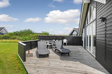 Huset har udgang til 3 terrasser mod syd, øst og vest, som gør at det altid er muligt at finde en plads i solen. Havestole, liggestole, parasol og grill fuldender den dejlige oplevelse det er at bo i den friske luft i nærheden af Vesterhavet. Fra Husets 1.200m3 store naturgrund er der kun 300 m til Vesterhavet og 800 m til nærmeste indkøbsmulighed.