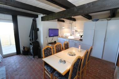 Dette rummelige sten-/træhus er indrettet med et kombineret køkken og stue, stuen er lyst og venlig og det store vinduesparti giver et godt lysindfald i rummet. Stuen er indrettet med lædermøbler og tæt på køkkenet står spisebordet, der er F-TV med danske (DR1 og DR2) og tyske programmer, Radio, CD. En dejlig brændeovn giver en behagelig varme også i den kolde tid. Køkkenet er godt udstyret og indeholder et el keramisk kogeplade, emhætte, køle-/fryseskab, opvaskemaskine, indbygningsovn. Der er stengulve i alle opholdsrum. På 1. sal er der en opholdsstue med polstermøbler og TV (kun til at spille på spillekonsol) herfra er der udgang til overdækket balkon. Huset råder over 3 soverum: 1DS (1. sal) + 1DS + 1E. Badeværelse med håndvask, bruser, toilet, gulvvarme. Rygning ikke tilladt. Max 3 husdyr er tilladt.