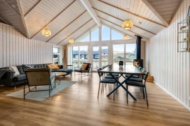 Allerede undervejs ud til dette flotte feriehus, fornemmer man husets fantastiske beliggenhed ved Vesterhavets store klitter. Huset er 111 m2 stort og har 4 dejlige soverum (1DS, 1DS, 1DS, 1DS). Flot, veludstyret køkken / alrum med alt i service / køkkengrej og alt i hårde hvidevarer. Køkkenhjørnet har bl.a. keramiske kogeplader, indbygnings ovn, emhætte, opvaskemaskine og køleskab med fryseboks. Nyd maden ved spisebordet, kig ud af vinduet og se de store høje klitter direkte ved Vesterhavet eller slap af i de bløde kvalitetsmøbler. Se TV på tysk på husets fjernsyn, som også har en Chromecast, eller lyt til musik på husets Sonos anlæg, hvor der kan streames musik til. Nyd flammerne ved den hyggelige brændeovn som sammen med den opsatte varmepumpe sørger for et minimalt forbrug til opvarmning. Der er praktiske trægulve i alle rum og huset er særdeles rengøringsvenligt.