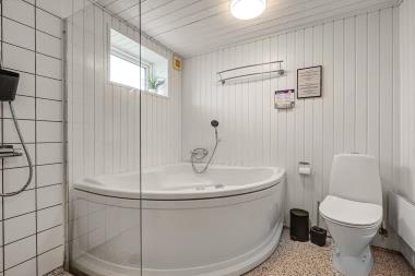 Huset er indrettet med to soveværelser – begge med en dobbeltseng. Herudover der der fra den kombinerede stue/køkken adgang til en hems med 2 sovepladser. Selve badeværelset har både spabad med bruser og hertil ovenikøbet en bruseniche. Toilet og håndvask er naturligvis standard.