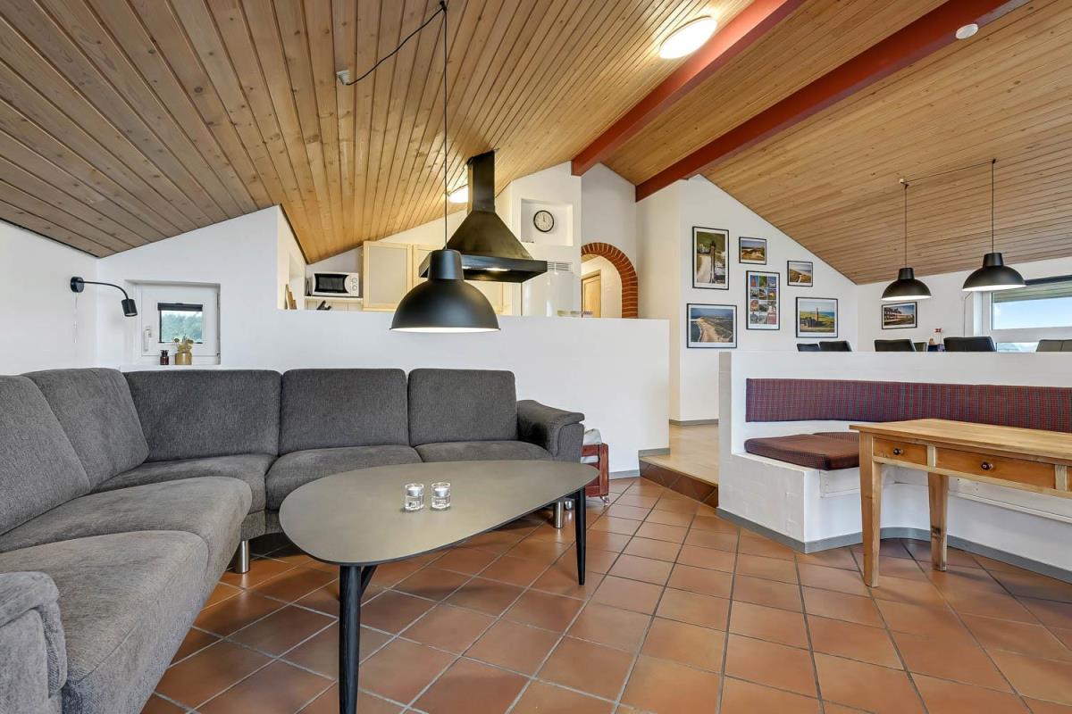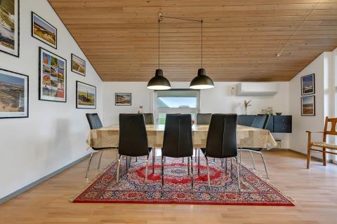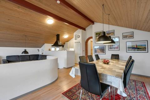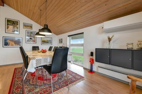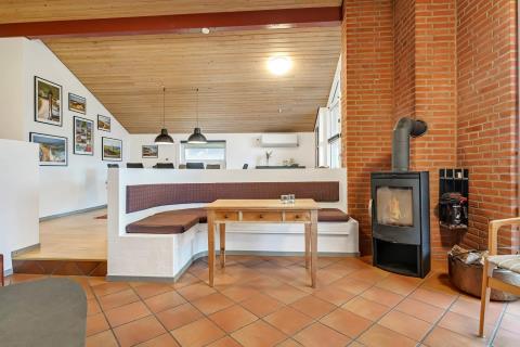 Komfortabelt indrettet feriehus i sten med nedsænket pejsestue med pæne møbler og inventar her der flisegulv. Stuen er indrettet med brændeovn og varmepumpe som begge kan give en behagelig varme og er med til at gøre jeres forbrug billigere, stereoanlæg med CD og TV med DR-kanalerne, der er desuden trådløst internet. Køkkenet som er kombineret med stuen, indeholder glaskeramisk komfur, emhætte, køleskab med 40 l. frostboks, mikroovn og opvaskemaskine. Gulv i køkken og stue er træ. 4 soverum: 1DS + 2S + 2S + 1DS. Huset har 2 badeværelser begge med toilet, håndvask og bruser. Det store badeværelse har desuden en spa og adgang til sauna. Begge badeværelser har klinkegulv og gulvvarme. Til de mindste gæster er der en barnestol. I depotrummet er der vaskemaskine og tørretumbler. Ikke rygerhus. 2 velopdragne husdyr er tilladt. Adgang til Harboøre-Centeret www.harbooere.dk/hallen